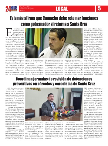 de Santa Cruz, retoma sus ac- de Chonchocoro desde finales cruceña reiteró que Camacho, al ellos debieron estar en su ciu- Asamblea Departamental es