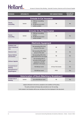 Annexure D: Business Policy Wording – Automatic Provisions, Extensions and First Amounts Payable