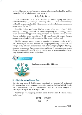 urutan berikutnya (8) dikurangi 1. Sekarang coba 1 + 2 + 4 + 8 = ? Jawabannya