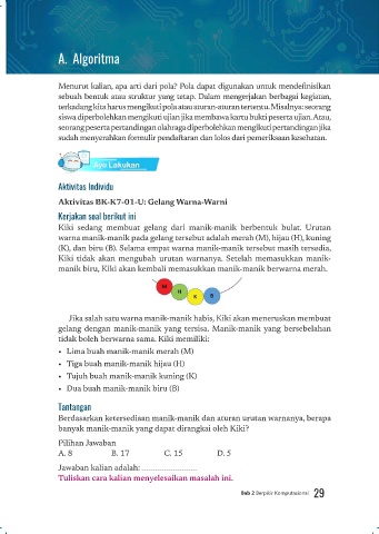 Kiki sedang membuat gelang dari manik-manik berbentuk bulat. Urutan