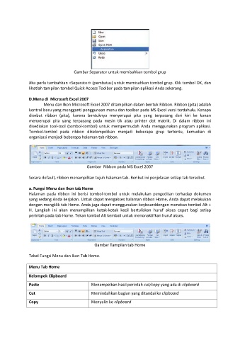 Menu dan Ikon Microsoft Excel 2007 ditampilkan dalam bentuk Ribbon. Ribbon (pita) adalah