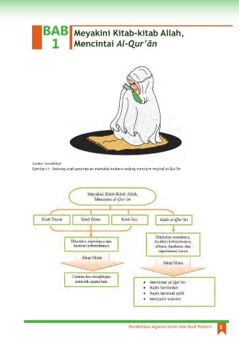 BAB Meyakini Kitab-kitab Allah, 1 Mencintai Al-Qur’ān Sumber: Kemdikbud Gambar 1.1 : Seorang anak perempuan memakai mukena sedang mencium mushaf al-Qur’ān Pendidikan Agama Islam dan Budi Pekerti 1