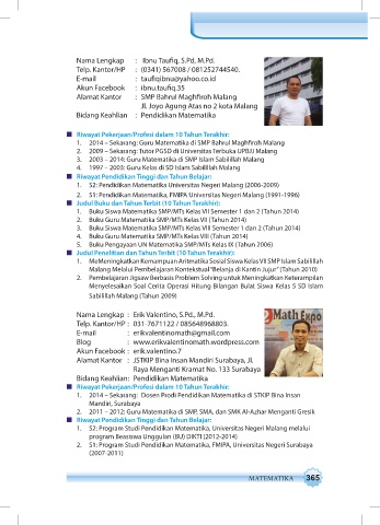 1. 2014 – Sekarang: Guru Matematika di SMP Bahrul Maghfiroh Malang