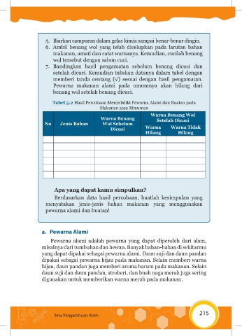 Tabel 5.2 Hasil Percobaan Menyelidiki Pewarna Alami dan Buatan pada