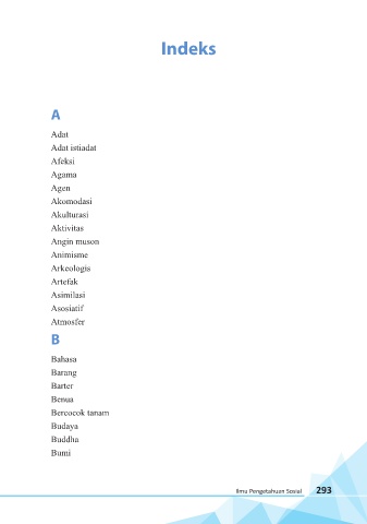 Indeks A Adat Adat istiadat Afeksi Agama Agen Akomodasi Akulturasi Aktivitas Angin muson Animisme Arkeologis Artefak Asimilasi Asosiatif Atmosfer B Bahasa Barang Barter Benua Bercocok tanam Budaya Buddha Bumi Ilmu Pengetahuan Sosial 293