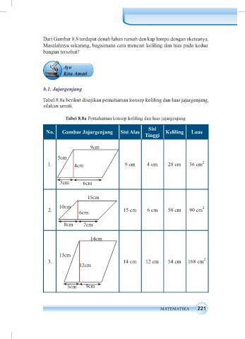 Tabel 8.8a berikut disajikan pemahaman konsep keliling dan luas jajargenjang,