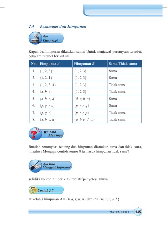Kapan dua himpunan dikatakan sama? Untuk menjawab pertanyaan tersebut,