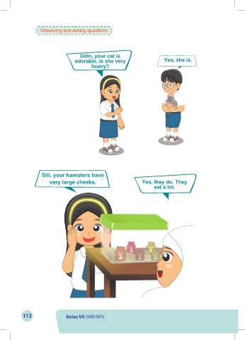 Observing and asking questions Udin, your cat is adorable. Is she very Yes, she is. heavy? Siti, your hamsters have very large cheeks. Yes, they do. They eat a lot. 112 Kelas VII SMP/MTs