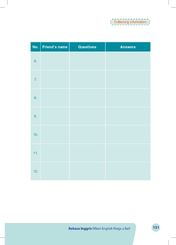 Collecting information No. Friend’s name Questions Answers 6. 7. 8. 9. 10. 11. 12. Bahasa Inggris When English Rings a Bell 131 Bahasa Inggris When English Rings a Bell