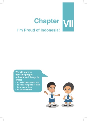 Chapter VII I’m Proud of Indonesia! We will learn to describe people, animals, and things in order: • to make them stand out • to show my pride of them • to promote them • to criticize them