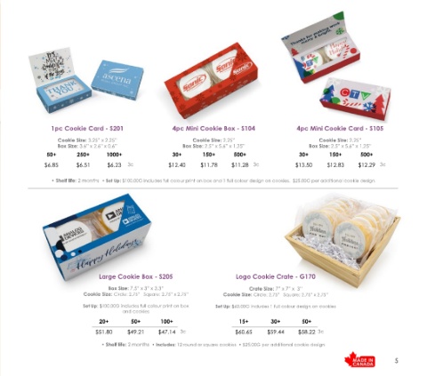 • Shelf life: 2 months • Set Up: $100.00G includes full colour print on box and 1 full colour design on cookies. $25.00G per additional cookie design