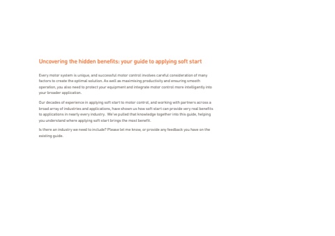 Uncovering the hidden benefits: your guide to applying soft startEvery motor system is unique, and successful motor control involves careful consideration of many factors to create the optimal solution. As well as maximising productivity and ensuring smooth operation, you also need to protect your equipment and integrate motor control more intelligently into your broader application.Our decades of experience in applying soft start to motor control, and working with partners across a broad array of industries and applications, have shown us how soft start can provide very real benefits to applications in nearly every industry. We%u2019ve pulled that knowledge together into this guide, helping you understand where applying soft start brings the most benefit.Is there an industry we need to include? Please let me know, or provide any feedback you have on the existing guide.