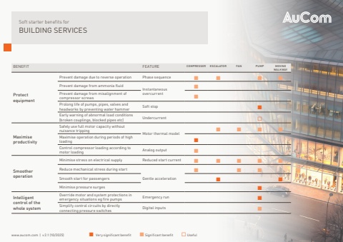 www.aucom.com | v 2.1 (10/2025) %u25a0 Very significant benefit %u25a0 Significant benefit %u25a1 UsefulSoft starter benefits forBUILDING SERVICESBENEFIT FEATURE COMPRESSOR ESCALATOR FAN PUMP MOVING WALKWAYProtect equipmentPrevent damage due to reverse operation Phase sequence %u25a0 %u25a0 %u25a0 %u25a0Prevent damage from ammonia fluid Instantaneous overcurrent%u25a0Prevent damage from misalignment of compressor screws %u25a0Prolong life of pumps, pipes, valves and headworks by preventing water hammer Soft stop %u25a0Early warning of abnormal load conditions (broken couplings, blocked pipes etc) Undercurrent %u25a1Maximise productivitySafely use full motor capacity without nuisance tripping Motor thermal model%u25a0 %u25a0 %u25a0 %u25a0Maximise operation during periods of high loading %u25a0Control compressor loading according to motor loading Analog output %u25a0Smoother operationMinimise stress on electrical supply Reduced start current %u25a0 %u25a0 %u25a0 %u25a0 %u25a0Reduce mechanical stress during startGentle acceleration%u25a0 %u25a0 %u25a0Smooth start for passengers %u25a0 %u25a0Minimise pressure surges %u25a0Intelligent control of the whole systemOverride motor and system protections in emergency situations eg fire pumps Emergency run %u25a0Simplify control circuits by directly connecting pressure switches Digital inputs %u25a0