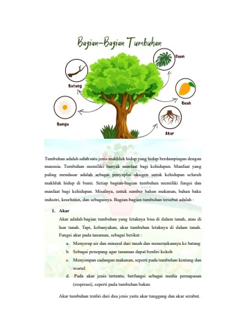 Tumbuhan adalah salah satu jenis makhluk hidup yang hidup berdampingan dengan manusia. Tumbuhan memiliki banyak manfaat bagi kehidupan. Manfaat yang paling mendasar adalah sebagai penyuplai oksigen untuk kehidupan seluruh makhluk hidup di bumi. Setiap bagian-bagian tumbuhan memiliki fungsi dan manfaat bagi kehidupan. Misalnya, untuk sumber bahan makanan, bahan baku industri, kesehatan, dan sebagainya. Bagian-bagian tumbuhan tersebut adalah :1.AkarAkar adalahbagian tumbuhanyang letaknya bisadi dalam tanah, atau di luar tanah. Tapi, kebanyakan, akar tumbuhan letaknya di dalam tanah. Fungsi akar pada tanaman, sebagai berikut : a.Menyerap air dan mineral dari tanah dan meneruskannya ke batang b.Sebagai penopang agar tanaman dapat berdiri kokoh c.Menyimpan cadangan makanan, seperti pada tumbuhan kentang dan worteld.Pada akar jenis tertentu, berfungsi sebagai media pernapasan (respirasi), seperti pada tumbuhan bakauAkar tumbuhan terdiri dari dua jenis yaituakar tunggang dan akar serabut.