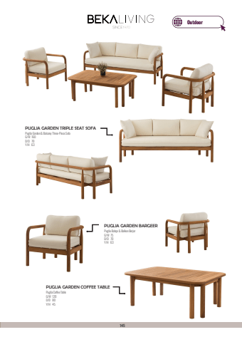 145SINCE 1970GPUGLIA GARDEN TRIPLE SEAT SOFAPuglia Garden & Balcony Three-Piece SofaG/W 160 D/D 70 Y/H 63 PUGLIA GARDEN COFFEE TABLEPuglia Coffee TableG/W 120D/D 80Y/H 45PUGLIA GARDEN BARGEERPuglia Bah%u00e7e & Balkon Berjer G/W 75 D/D 70 Y/H 63Outdoor