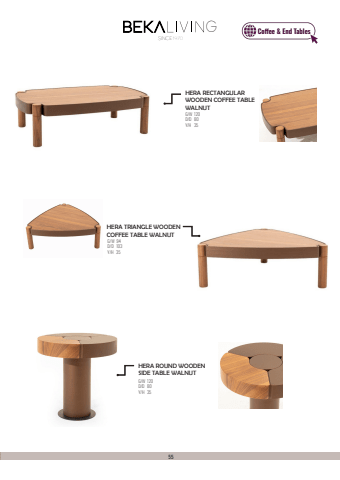 55SINCE 1970GHERA TRIANGLE WOODEN COFFEE TABLE WALNUTG/W 94 D/D 103Y/H 35HERA RECTANGULAR WOODEN COFFEE TABLE WALNUTG/W 120 D/D 80Y/H 35 HERA ROUND WOODEN SIDE TABLE WALNUTG/W 120 D/D 80Y/H 35 Coffee & End Tables