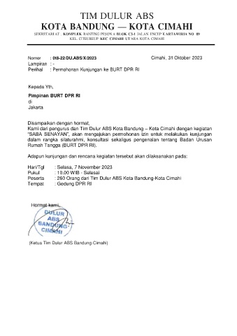 Perihal : Permohonan Kunjungan ke BURT DPR RI