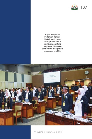 107 107 Rapat Paripurna Parlemen Remaja dilakukan di ruang Sidang Paripurna II, yakni ruang sidang yang biasa digunakan DPR untuk mengambil keputusan terakhir. PARLEMEN REMAJA 2018 PARLEMEN REMAJA 2018