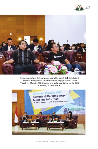 43 Semakin malam diskusi panel semakin seru! Kali ini diskusi panel III menghadirkan narasumber Anggota DPR, Dede Yusuf M. Efendi; CEO Ruangguru, Adamas Belva; serta CEO Kitabisa, Alfatih Timur. PARLEMEN REMAJA 2018