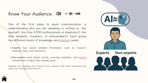 Oneofthefirststepstogoodcommunicationisunderstandingwhoyouarespeakingorwritingto.Askyourself:AretheySTEMprofessionalsorbeginners?Aretheystudents,investors,orpolicymakers?Eachgrouphasdifferentlevelsofknowledgeanddistinctneeds.Expertsmayexpectdetailedinformation,suchasresearchmethods,data,andreferences.Non-expertsneedsimplerwords,everydayexamples,andexplicitcomparisonstoideastheyalreadyknow.Adaptingyourlanguageandcontenttoyouraudiencehelpsthemunderstandandmakesyourmessagemoreeffective.KnowYourAudience06