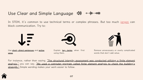 UseClearandSimpleLanguageInSTEM,it%u2019scommontousetechnicaltermsorcomplexphrases.Buttoomuchjargoncanblockcommunication.Tryto:voice.usingthm.wordstatdon%u2019taddvalue.Forinstance,ratherthansaying,%u201cThestructuralintegrityassessmetwasconductedutilizingafiniteelementanalysis,%u201dyoucansay,%u201cWeusedacomputerprogramcalledfiniteelementanalysistocheckthebuilding%u2019sstrength.%u201dSimplewordingmakesyourworkeasiertofollow.07