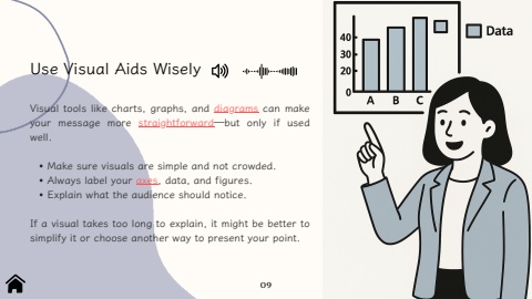 Visualtoolslikecharts,graphs,anddiagramscanmakeyourmessagemorestraightforward%u2014butonlyifusedwell.MakesurevisualsarAlwayslabelyouraxes,data,andfigures.Explainwhattheaudienceshouldnotice.Ifavisualtakestoolongtoexplain,itmightbebettertosimplifyitorchooseanotherwaytopresentyourpoint.UseVisualAidsWisely09