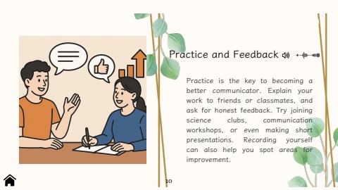 PracticeandFeedbackPracticeisthekeytobecomingabettercommunicator.Explainyourworrensorcssmesanaskforhonestfeedback. Try joiningscienceclubs,communicationworkshops,orevenmakingshortpresentations.Recordingyourselfcanalsohelpyouspotareasforimprovement.0