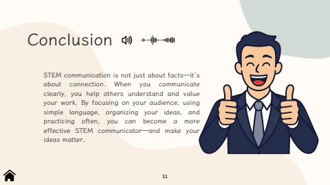 ConcluSTEMcommunicationisnotjustaboutfacts%u2014it%u2019saboutconnection.Whenyoucommunicateclearly,youhelpothersunderstandandvalueyourwork.Byfocusingonyouraudience,usingsimplelanguage,organizingyourideas,andpracticingoften,youcanbecomeamoreeffectiveSTEMcommunicator%u2014andmakeyourideasmatter.11