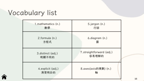 1.mathematics(n.)%u6578%u5b785.jargon(n.)%u884c%u8a712.formula(n.)%u65b9%u7a0b%u5f0f6.diagram(n.)%u57163.distinct(adj.)%u660e%u986f%u4e0d%u540c%u76847aightforwad(a%u5bb9%u6613%u7406%u89e3%u76844.explicit(adj.)%u6e05%u695a%u660e%u767d%u76848.axes(axis%u7684%u8907%u6578)(n.)%u8ef8Vocabularylist15