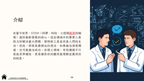 %u4ecb%u7d39%u5728%u7576%u4eca%u4e16%u754c%uff0cSTEM%uff08%u79d1%u5b78%u3001%u79d1%u6280%u3001%u5de5%u7a0b%u8207%u6578%u5b78%u7684%u7e2e%u5beb%uff09%u8655%u65bc%u5275%u65b0%u767c%u5c55%u7684%u6838%u5fc3%u3002%u9019%u4e9b%u9818%u57df%u4e2d%u7684%u5c08%u696d%u4eba%u54e1%u81f4%u529b%u65bc%u89e3%u6c7a%u91cd%u5927%u554f%u984c%u767c%u660e%u65b0%u5de5%u5177%u4e26%u6539%u5584%u4eba%u5011%u7684%u751f%u6d3b%u3002%u7136%u800c%uff0c%u5373%u4f7f%u662f%u6700%u5091%u51fa%u7684%u60f3%u6cd5%uff0c%u5982%u679c%u7121%u6cd5%u6e05%u695a%u50b3%u9054%uff0c%u4e5f%u53ef%u80fd%u7121%u6cd5%u6210%u529f%u3002%u5728%u7406%u5de5%u9818%u57df%uff0c%u6709%u6548%u6e9d%u901a%u4e0d%u53ea%u662f%u8ffd%u6c42%u6e96%u78ba%u6027%uff0c%u66f4%u662f%u78ba%u4fdd%u4f60%u7684%u807d%u773e%u80fd%u7406%u89e3%u4e26%u61c9%u7528%u4f60%u7684%u8a0a%u606f%u300216%u5230%u82f1%u6587%u4ecb%u9762%u8907%u7fd2__