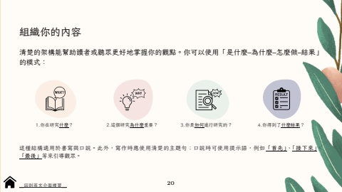 %u7d44%u7e54%u4f60%u7684%u5167%u5bb9%u6e05%u695a%u7684%u67b6%u69cb%u80fd%u5e6b%u52a9%u8b80%u8005%u6216%u807d%u773e%u66f4%u597d%u5730%u638c%u63e1%u4f60%u7684%u89c0%u9ede%u3002%u4f60%u53ef%u4ee5%u4f7f%u7528%u300c%u662f%u4ec0%u9ebc%u2013%u70ba%u4ec0%u9ebc%u2013%u600e%u9ebc%u505a%u2013%u7d50%u679c%u300d%u7684%u6a21%u5f0f%uff1a%u9019%u7a2e%u7d50%u69cb%u9069%u7528%u65bc%u66f8%u5beb%u8207%u53e3%u8aaa%u3002%u6b64%u5916%uff0c%u5beb%u4f5c%u6642%u61c9%u4f7f%u7528%u6e05%u695a%u7684%u4e3b%u984c%u53e5%uff1b%u53e3%u8aaa%u6642%u53ef%u4f7f%u7528%u63d0%u793a%u8a9e%uff0c%u4f8b%u5982%u300c%u9996%u5148%u300d%u3001%u300c%u63a5%u4e0b%u4f86%u300d%u300c%u6700%u5f8c%u300d%u7b49%u4f86%u5f15%u5c0e%u89c0%u773e%u300220__%u56de%u5230%u82f1%u6587%u4ecb%u9762%u8907%u7fd2__