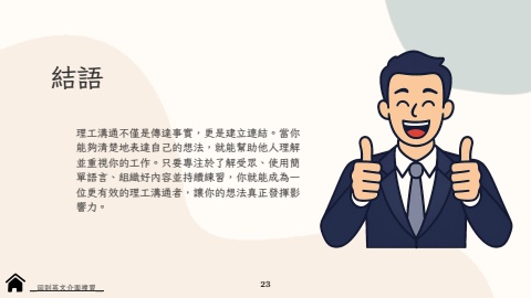 %u7d50%u8a9e%u7406%u5de5%u6e9d%u901a%u4e0d%u50c5%u662f%u50b3%u9054%u4e8b%u5be6%uff0c%u66f4%u662f%u5efa%u7acb%u9023%u7d50%u3002%u7576%u4f60%u80fd%u5920%u6e05%u695a%u5730%u8868%u9054%u81ea%u5df1%u7684%u60f3%u6cd5%uff0c%u5c31%u80fd%u5e6b%u52a9%u4ed6%u4eba%u7406%u89e3%u4e26%u91cd%u8996%u4f60%u7684%u5de5%u4f5c%u3002%u53ea%u8981%u5c08%u6ce8%u65bc%u4e86%u89e3%u53d7%u773e%u3001%u4f7f%u7528%u7c21%u55ae%u8a9e%u8a00%u3001%u7d44%u7e54%u597d%u5167%u5bb9%u4e26%u6301%u7e8c%u7df4%u7fd2%uff0c%u4f60%u5c31%u80fd%u6210%u70ba%u4e00%u4f4d%u66f4%u6709%u6548%u7684%u7406%u5de5%u6e9d%u901a%u8005%uff0c%u8b93%u4f60%u7684%u60f3%u6cd5%u771f%u6b63%u767c%u63ee%u5f71%u97ff%u529b%u300223__%u56de%u5230%u82f1%u6587%u4ecb%u9762%u8907%u7fd2__