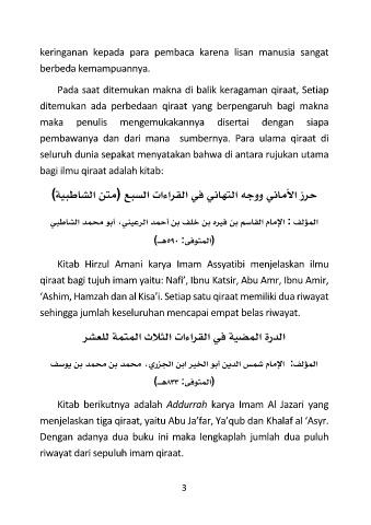 menjelaskan tiga qiraat, yaitu Abu Ja’far, Ya’qub dan Khalaf al ‘Asyr.