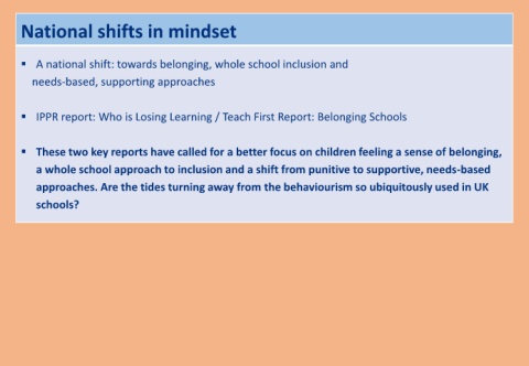 a whole school approach to inclusion and a shift from punitive to supportive, needs-based