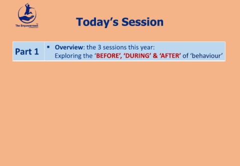 Today’s Session ▪ Overview: the 3 sessions this year: Part 1 Exploring the ‘BEFORE’, ‘DURING’ & ‘AFTER’ of ‘behaviour’