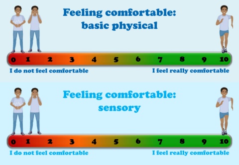 Feeling comfortable: basic physical 2 0 1 3 4 5 6 7 8 9 10 I do not feel comfortable I feel really comfortable Feeling comfortable: sensory 0 1 3 4 5 6 7 8 9 10 2 I do not feel comfortable I feel really comfortable