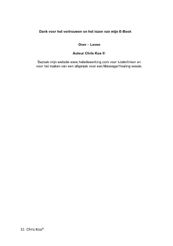 Dank voor het vertrouwen en het lezen van mijn E-Book Over – Leven Auteur Chris Koa ® Bezoek mijn website www.heledewerking.com voor luisterlinken en voor het maken van een afspraak voor een Massage/Healing sessie. 51 Chris Koa®