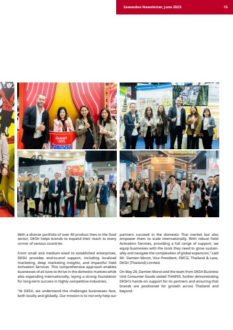 15With a diverse portfolio of over 40 product lines in the food sector, DKSH helps brands to expand their reach to every corner of various countries. From small and medium-sized to established enterprises, DKSH provides end-to-end support, including localizedmarketing, deep marketing insights, and impactful FieldActivation Services. This comprehensive approach enables businesses of all sizes to thrive in the domestic markets while also expanding internationally, laying a strong foundation for long-term success in highly competitive industries.%u201cAt DKSH, we understand the challenges businesses face, both locally and globally. Our mission is to not only help our partners succeed in the domestic Thai market but alsoempower them to scale internationally. With robust FieldActivation Services, providing a full range of support, we equip businesses with the tools they need to grow sustainably and navigate the complexities of global expansion,%u201d said Mr. Damien Morot, Vice President, FMCG, Thailand & Laos, DKSH (Thailand) Limited. On May 28, Damien Morot and the team from DKSH Business Unit Consumer Goods visited THAIFEX, further demonstrating DKSH%u2019s hands-on support for its partners and ensuring that brands are positioned for growth across Thailand andbeyond. Sawasdee Newsletter, June 2025