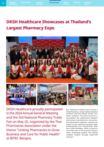 16 DKSH Healthcare Showcases at Thailand%u2019s Largest Pharmacy ExpoDKSH Healthcare proudly participatedin the 2024 Annual General Meeting and the 3rd National Pharmacy Trade Fair on May 25, organized by the Thai Pharmacies Association under the theme \Business and Care for Public Health\at BITEC Bangna.Our Healthcare Alliance team hosted a booth featuring a range of pharmaceutical products and also joined various academic seminars. The event served as a key platform for collaboration between pharmacies, manufacturers, consumers, and government agencies, shaping the future of the pharmacy business both professionally and commercially. With over 4,000 attendees, DKSH is proud to have been part of this premier industryevent, showcasing products and sharing valuable insights through expert-led seminars.Sustainability Business & StrategyDKSH inthe NewsHR Corner Upcoming Events Awards & Recognitions Events & Expos