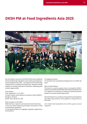 17We are thrilled to announce that DKSH Performance Materials(Food and Beverage ingredients Team) will be participating inFood Ingredients Asia 2025 %u2014the largest food and beverage industry event in Southeast Asia! Mark your calendars and get ready for an exciting showcase of innovation, networking, and business opportunities. Event Details Date: September 17%u201319, 2025 Location: Queen Sirikit National Convention Center (QSNCC), Bangkok, Thailand Booth: Hall 2, Booth No. H02 What to Expect at FIA 2025? DKSH will host a dynamic and interactive booth featuring:%u2714 Our key clients showcasing the latest innovations in food and beverage ingredients. %u2714 Live demonstrations to highlight ingredient applications and solutions. DKSH PM at Food Ingredients Asia 2025 %u2714 Engaging activities. %u2714 Innovative and sustainable prototypes from our DKSH Lab team. Why FIA 2025 Matters This event is a prime opportunity to strengthen DKSH's presence and build relationships with industry professionals. It%u2019s a platform to showcase our expertise and drive business growth in the food and beverage sector. We look forward to an exciting and impactful Food Ingredients Asia 2025. Stay tuned for more updates as we get closer to the event! Let%u2019s make Food Ingredients Asia 2025 a great successtogether! Sawasdee Newsletter, June 2025