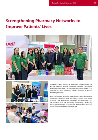 19Strengthening Pharmacy Networks toImprove Patients%u2019 Lives The Alliance team from DKSH Healthcare Thailand joined the Annual Scientific Seminar hosted by the Krabi Community Pharmacy Association - an initiative designed to upskill local pharmacists and pharmacy owners through scientificknowledge sharing.With discussions on timely health topics such as nicotinereduction therapies, allergy-related rhinitis, and otherpractical care approaches, the event attracted over 200participants from the pharmacy community - reflecting a strong commitment to continuous learning and collaboration in Thailand%u2019s healthcare landscape.Sawasdee Newsletter, June 2025