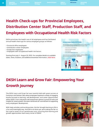 28 Awards & Recognitions Sustainability Business & StrategyEvents & Expos HR Corner Upcoming Events DKSH inthe NewsHealth Check-ups for Provincial Employees,Distribution Center Staff, Production Staff, and Employees with Occupational Health Risk Factors DKSH Learn and Grow Fair: Empowering Your Growth Journey DKSH prioritizes the health care of all employees and has facilitated annual health check-ups for various employee groups as follows: %u2022 Provincial office employees %u2022 Distribution center employees %u2022 Production employees %u2022 Employees with occupational health risk factors Starting from July 4 %u2013 August 29, 2025. For complete details on available dates, times, locations, and additional essential information, click here.The DKSH Learn and Grow Fair was recently held with great success at Fantorium and Fantree Caf%u00e9, where employees explored a variety of engaging booths focused on learning, self-development, and career opportunities within DKSH. From interactive self-assessment games to practical tools and insights for career growth, the event reinforced our commitment to supporting every employee%u2019s development. With lively activities and exciting prizes, the fair brought learning to life in a fun and meaningful way. And we%u2019re not done yet, we%u2019re taking the fair on the road to seven of our warehouses soon, ensuring that learning and growth opportunities reach every corner of DKSH!