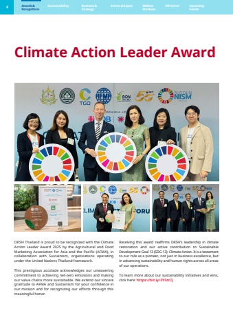 4 Awards & Recognitions Sustainability Business & StrategyEvents & Expos DKSH inthe NewsHR Corner Upcoming Events Climate Action Leader Award DKSH Thailand is proud to be recognized with the Climate Action Leader Award 2025 by the Agricultural and FoodMarketing Association for Asia and the Pacific (AFMA), incollaboration with Sustainism, organizations operating under the United Nations Thailand framework. This prestigious accolade acknowledges our unwavering commitment to achieving net-zero emissions and making our value chains more sustainable. We extend our sincere gratitude to AFMA and Sustainism for your confidence in our mission and for recognizing our efforts through this meaningful honor. Receiving this award reaffirms DKSH%u2019s leadership in climate restoration and our active contribution to SustainableDevelopment Goal 13 (SDG 13): Climate Action. It is a testament to our role as a pioneer, not just in business excellence, but in advancing sustainability and human rights across all areas of our operations. To learn more about our sustainability initiatives and wins, click here: https://bit.ly/3Y5tz7j