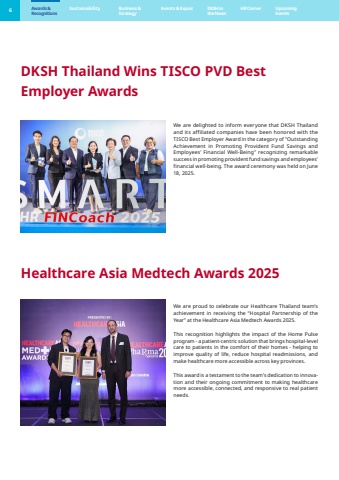 6 DKSH Thailand Wins TISCO PVD BestEmployer AwardsHealthcare Asia Medtech Awards 2025We are delighted to inform everyone that DKSH Thailand and its affiliated companies have been honored with the TISCO Best Employer Award in the category of \Achievement in Promoting Provident Fund Savings andEmployees%u2019 Financial Well-Being\success in promoting provident fund savings and employees' financial well-being. The award ceremony was held on June 18, 2025. We are proud to celebrate our Healthcare Thailand team%u2019s achievement in receiving the %u201cHospital Partnership of the Year%u201d at the Healthcare Asia Medtech Awards 2025.This recognition highlights the impact of the Home Pulseprogram - a patient-centric solution that brings hospital-level care to patients in the comfort of their homes - helping toimprove quality of life, reduce hospital readmissions, and make healthcare more accessible across key provinces. This award is a testament to the team%u2019s dedication to innovation and their ongoing commitment to making healthcare more accessible, connected, and responsive to real patient needs.Awards & Recognitions Sustainability Business & StrategyEvents & Expos DKSH inthe NewsHR Corner Upcoming Events