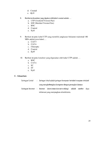 10. Berikut ini jenis konektor yang digunakan oleh kabel UTP adalah….