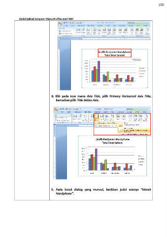 Modul Aplikasi Komputer Microsoft office word 2007 8. Klik pada icon menu Axis Title, pilih Primary Horizontal Axis Title, kemudian pilih Title Below Axis. 9. Pada kotak dialog yang muncul, ketikkan judul axisnya “Merek Handphone”.