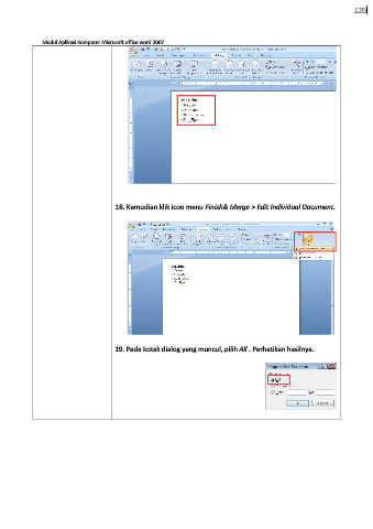 Modul Aplikasi Komputer Microsoft office word 2007 18. Kemudian klik icon menu Finish& Merge > Edit Individual Document. 19. Pada kotak dialog yang muncul, pilih All . Perhatikan hasilnya.