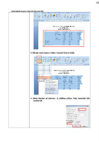Modul Aplikasi Komputer Microsoft office word 2007 3. Klik tab menu Insert > Table > Convert Text to Table. 4. Isikan Number of columns : 5, aktifkan pilihan Tabs, kemudian klik tombol OK.