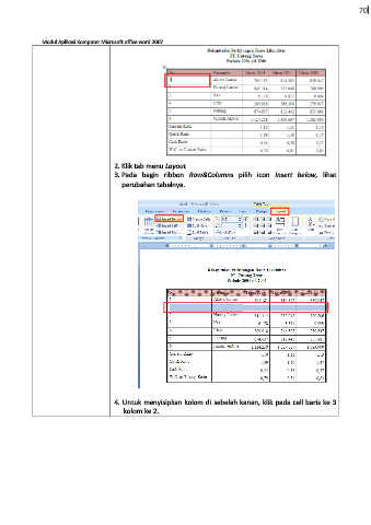 Modul Aplikasi Komputer Microsoft office word 2007 2. Klik tab menu Layout 3. Pada bagin ribbon Row&Columns pilih icon Insert below, lihat perubahan tabelnya. 4. Untuk menyisipkan kolom di sebelah kanan, klik pada cell baris ke 3 kolom ke 2.