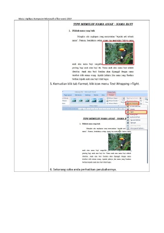 Modul Aplikasi Komputer Microsoft office word 2007 5. Kemud ian klik tab Format, klik icon menu Text Wrapping >Tight. 6. Sekarang coba anda perhatikan perubahannya.